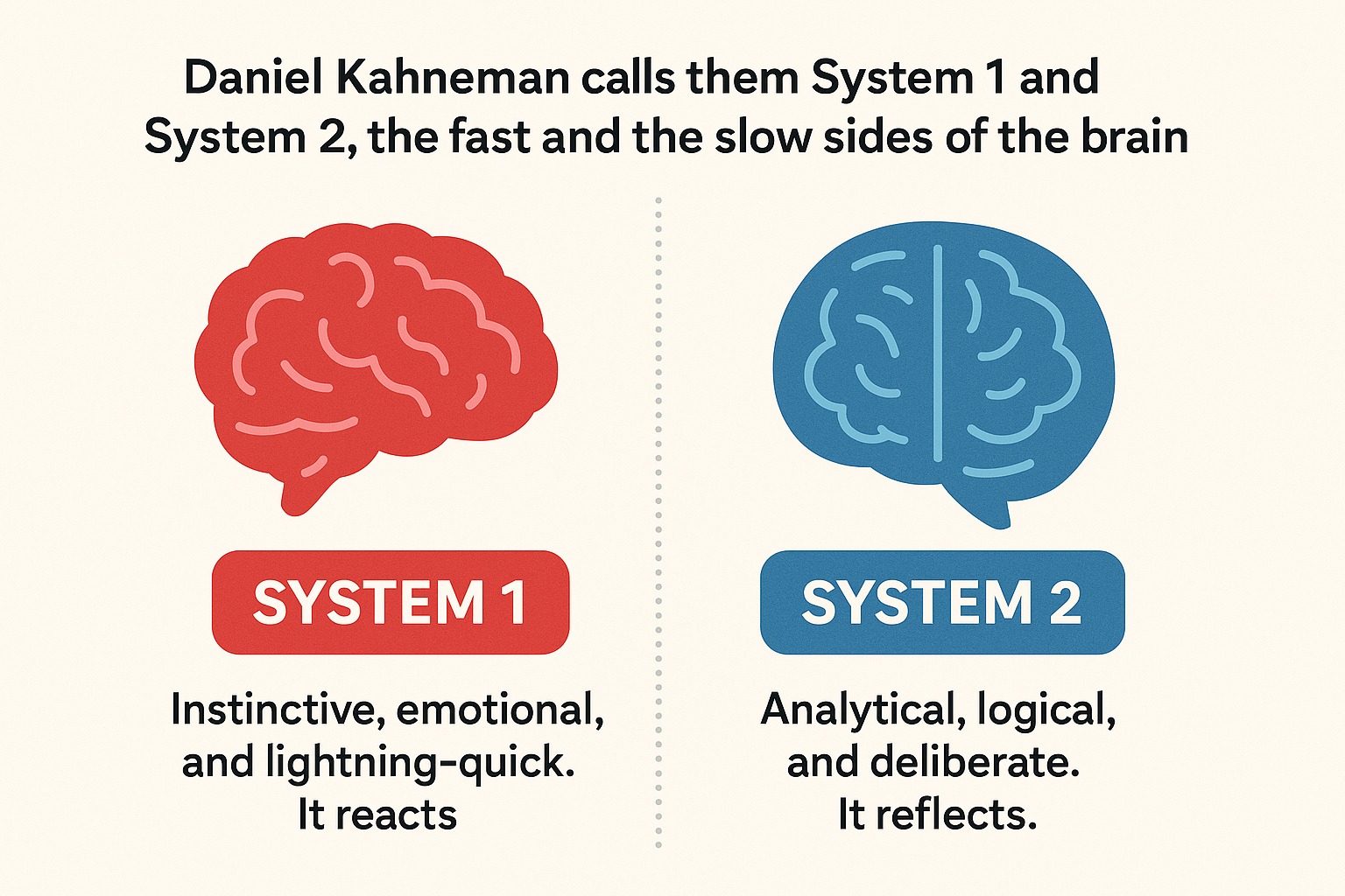 Daniel Kahneman calls them System 1 and System 2, the fast and the slow sides of the brain.