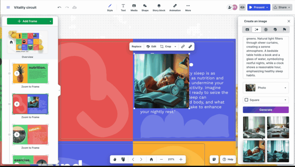 (Prezi also has a new feature that allows you to generate an AI-created photo, in case you can’t find the graphics or photos you’re looking for in the stock library.)